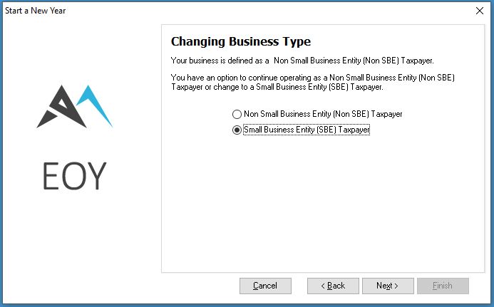 As part of setting up a file in AssetManager Pro you can define to be a Non-Small Business Entity (Non-SBE) or a Small Business Entity (SBE) BUT it is also possible to change from a Non-SBE to an SBE.